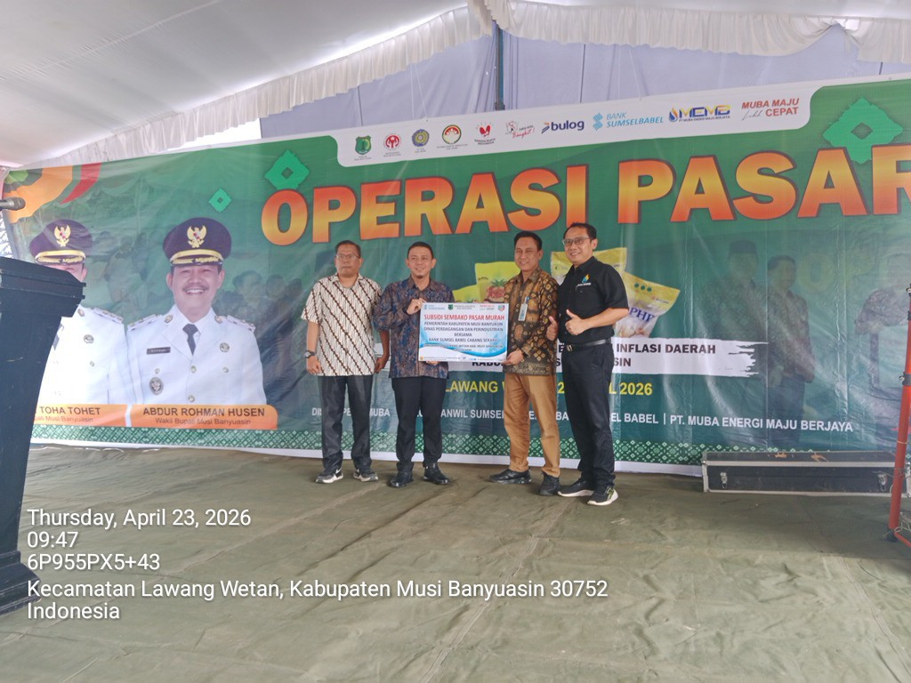 Direktur Utama PT. Muba Energi Maju Berjaya (Perseroda) Bapak H. DONNY MEILANO, bersama Kepala Cabang Bank SumselBabel Bapak IRWAN ANTONI menyerahkan Bantuan Gerakan Pangan Murah Tahun 2026 untuk masyarakat Kecamatan Sekayu, Kecamatan Lais dan Kecamatan Babat Supat kepada Sekretaris Daerah Kabupaten Musi Banyuasin Bapak SYAFARUDDIN melalui Plt. Kepala Dinas Ketahanan Pangan Bapak APRIYADI, disaksikan oleh Kasat Binmas Polres Musi Banyuasin Bapak AKP. BENI.